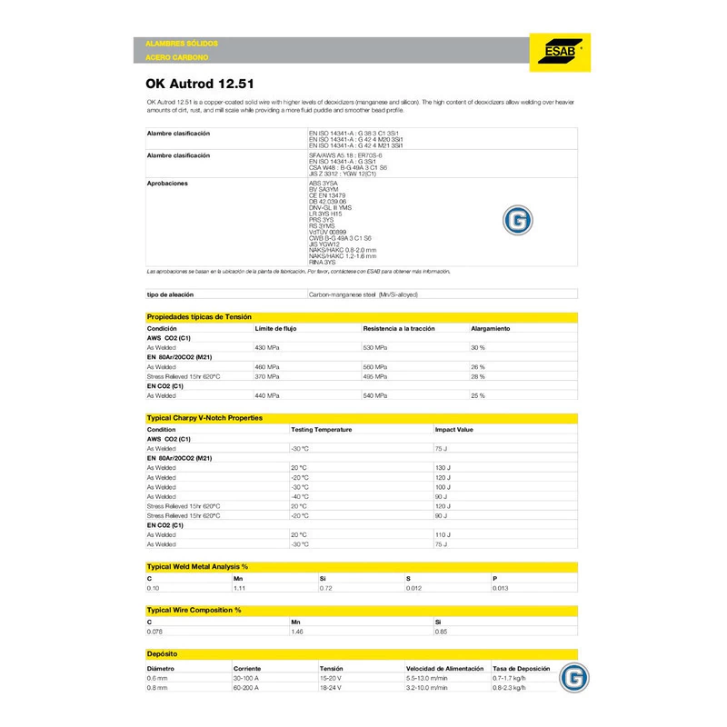 El OK Autrod 12.51 puede soldarse con Ar/20CO2 o con CO2 puro como gases de protección.