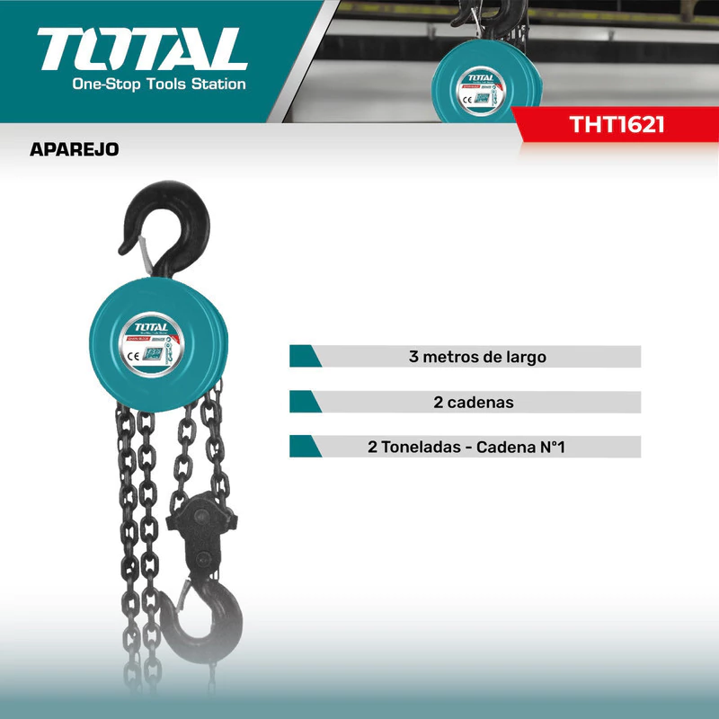 El Aparejo a Cadena 2 Toneladas Total, modelo THT1621, es una herramienta robusta y confiable diseñada para facilitar el levantamiento de cargas pesadas.