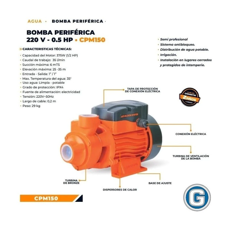 La bomba Lüsqtoff CPM150 genera mayor presión, lo que permite que los líquidos suban hasta una altura máxima de 8m.