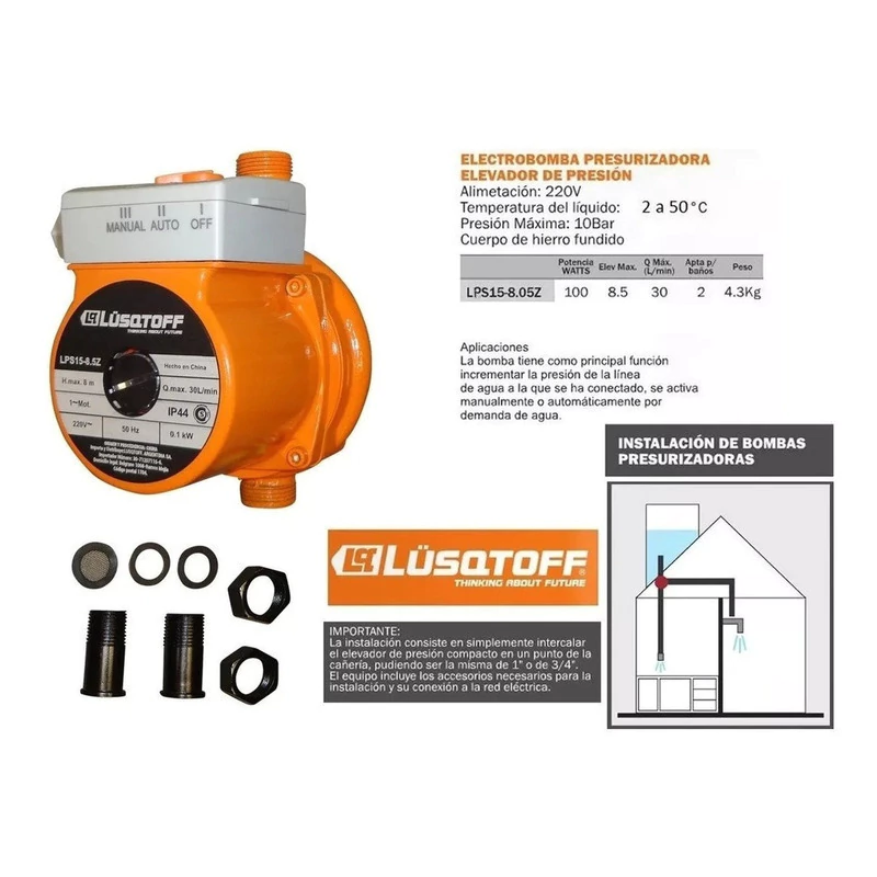Bomba Presurizadora Agua 0,5hp Lusqtoff 100w LPS15-8.5Z 220V
