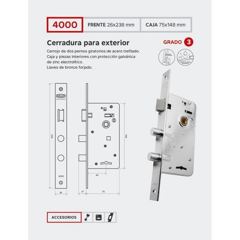Si te preocupa la seguridad de tu inmueble, este producto es para vos. Mantené tus puertas aseguradas con la cerradura Kallay 4000 Herrajes CERRADURA PUERTA EXTERIOR INOXIDABLE y salí sin preocupaciones.