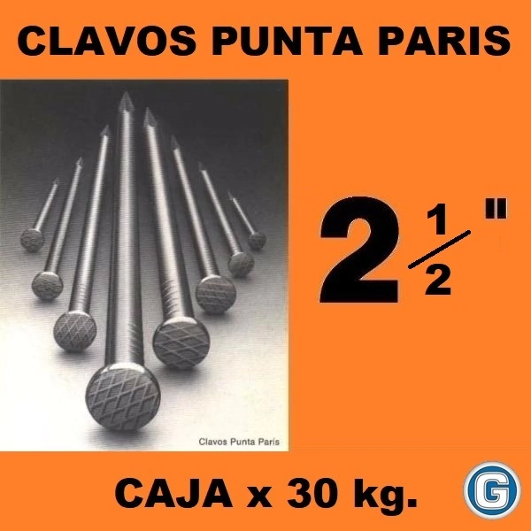 CLAVOS PUNTA PARIS DE 2 1/2" DE LARGO (63,50 mm.) y 3,33 mm. DE DIÁMETRO MARCA ACINDAR EN CAJA DE 30 kg.