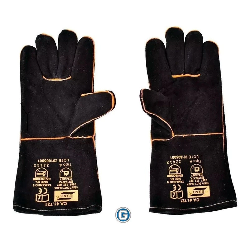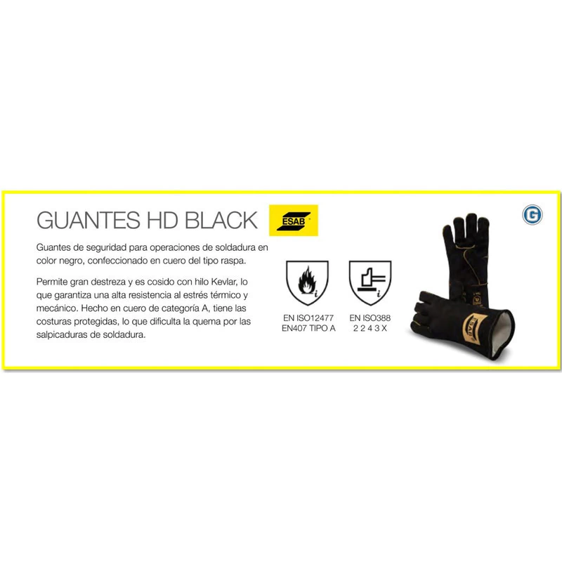Guante de seguridad para operaciones de soldadura en color negro, confeccionados en cuero del tipo raspa. Permite una gran destreza y esta cosido con hilo de Kevlar, lo que garantiza una alta resistencia al estrés térmico y a la tensión mecanica. Confeccionado en cuero de categoría A, con coturas protegidas, lo que dificulta la quema por las salpicaduras de las soldadura.