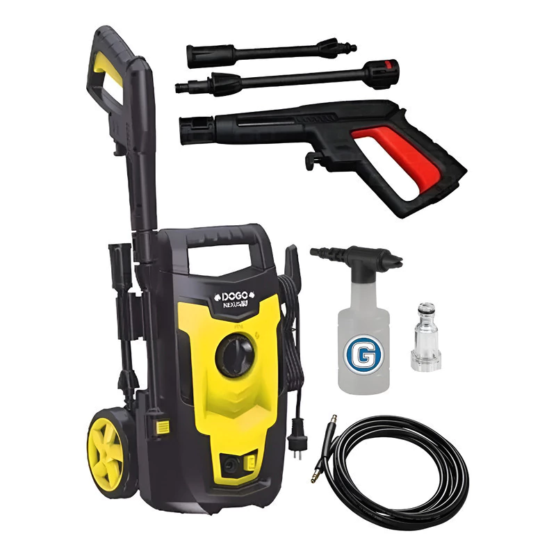 - Hidrolavadora ideal para el uso hogareño, este equipo cuenta con un potente motor a escobillas de 1400W, manguera de alta presión con un largo total de 5 mt. y lanza de muy buena calidad en acero inoxidable recubierta por plástico.