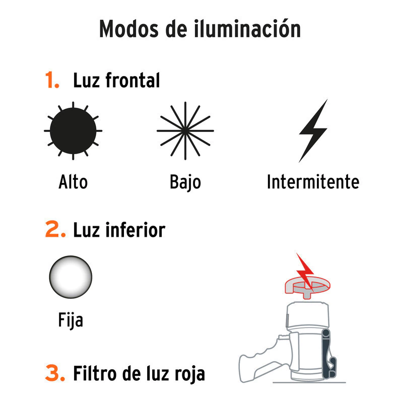 Modos de iluminación: Frontal (alto, bajo, intermitente), luz inferior (fija) y filtro de luz roja