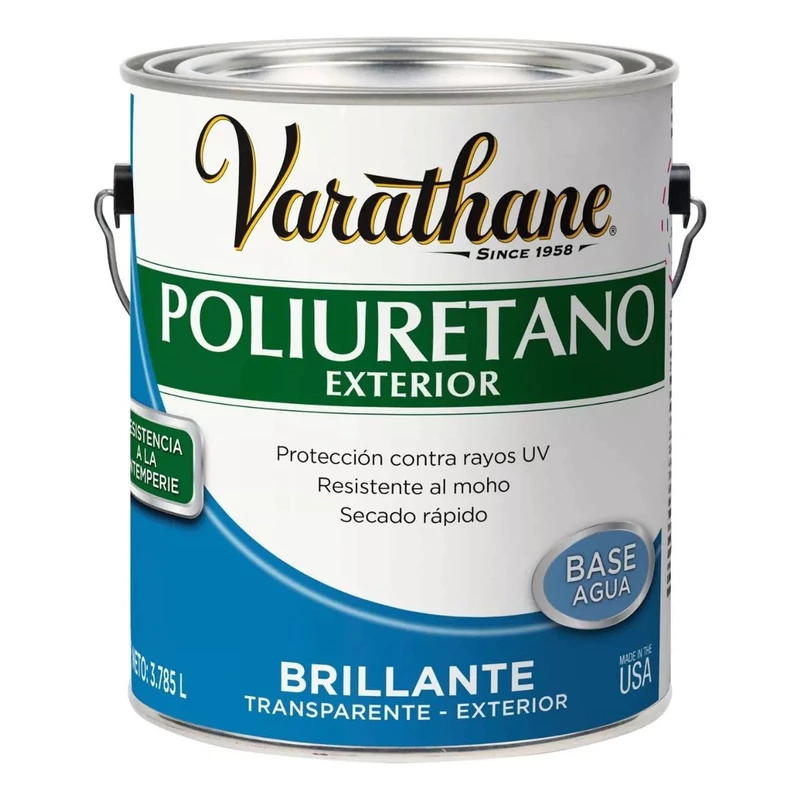 "El Poliuretano de Exterior Varathane® ofrece la máxima protección para proyectos de madera de exterior, como muebles de jardín, puertas, barandas, contramarcos de ventanas y más. Especialmente formulado para proteger la madera del deterioro ocasionado por los rayos solares, el agua, la intemperie, el rocío de agua marina y los productos químicos, es completamente transparente, muy duradero y de fácil limpieza.