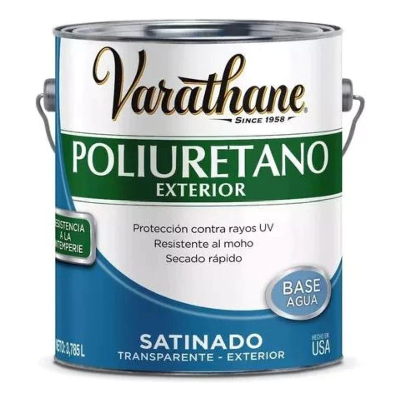 "El Poliuretano de Exterior Varathane® ofrece la máxima protección para proyectos de madera de exterior, como muebles de jardín, puertas, barandas, contramarcos de ventanas y más. Especialmente formulado para proteger la madera del deterioro ocasionado por los rayos solares, el agua, la intemperie, el rocío de agua marina y los productos químicos, es completamente transparente, muy duradero y de fácil limpieza.