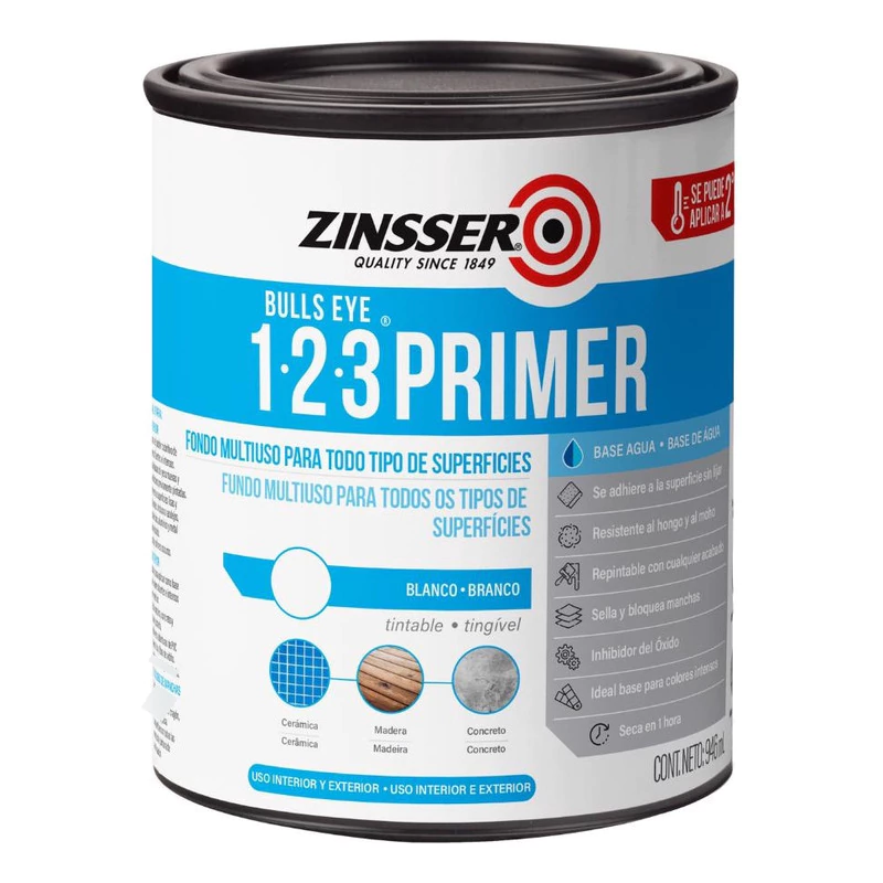 El Primer Imprimante Multiuso Blanco Satinado Zinsser 1-2-3 946 es el aliado perfecto para transformar tus espacios tanto en interiores como exteriores. Con su fórmula de base acuosa, podrás aplicarlo en una amplia variedad de superficies como asfalto, azulejo, concreto, galvanizado, ladrillo, madera, melamina, metal, PVC, plástico, vidrio y yeso. Su color blanco satinado le dará un acabado elegante y moderno a tus proyectos.