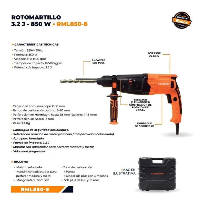 Este rotomartillo Lüsqtoff RML850-9 es lo que necesitás para encarar trabajos pesados, seas una persona aficionada o un profesional. Su funcionamiento es muy similar al de un taladro, solo que esta herramienta es más potente y permite trabajar en materiales más firmes.