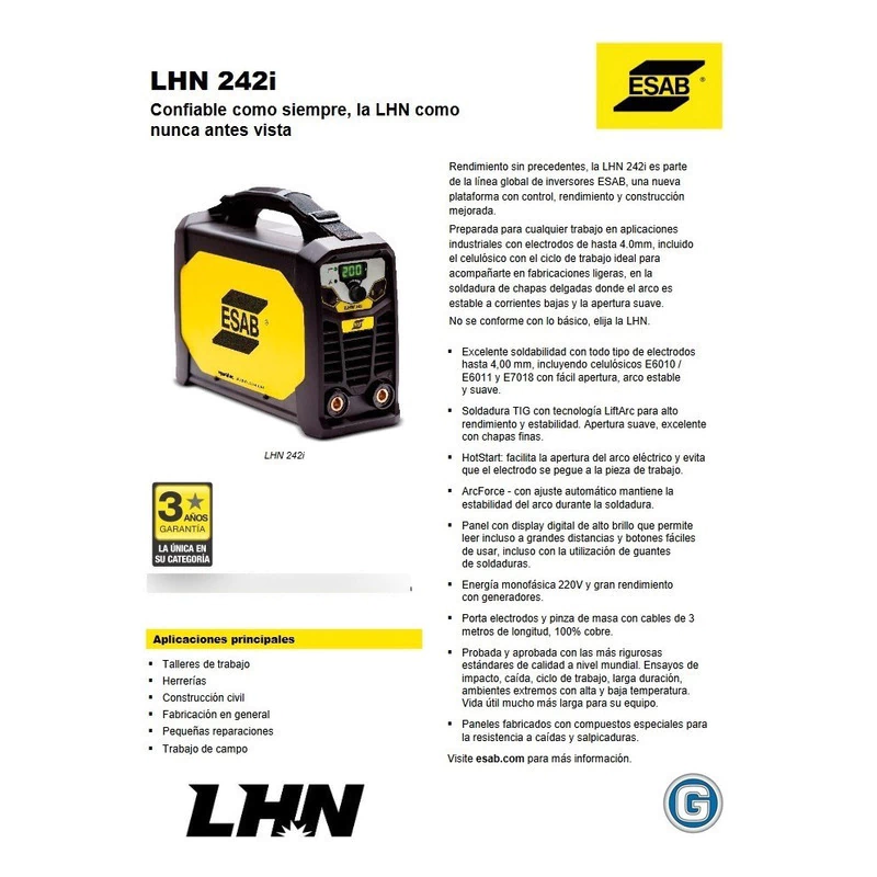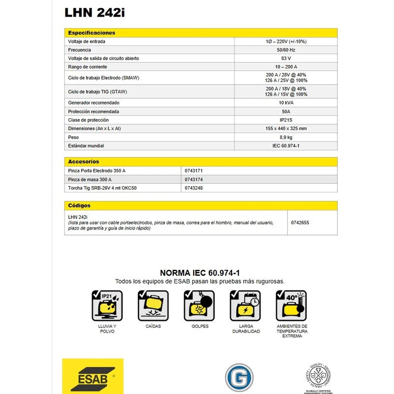 Soldadora electrodos + Lift Tig LHN 242i ESAB