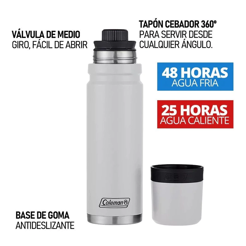 - El Termo Coleman esta construido en acero inoxidable 18/8 de doble pared, con aislamiento al vacío, lo que mantiene el agua caliente por hasta 25 horas, y fría por hasta 48 horas