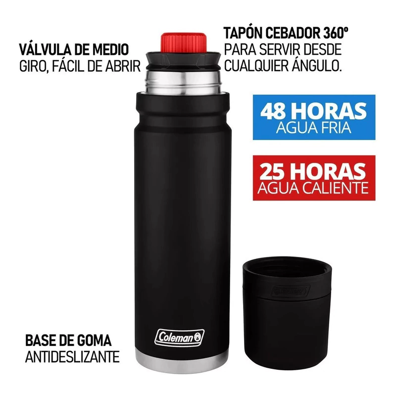 - El Termo Coleman esta construido en acero inoxidable 18/8 de doble pared, con aislamiento al vacío, lo que mantiene el agua caliente por hasta 25 horas, y fría por hasta 48 horas