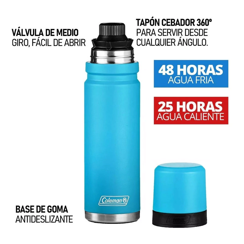 - El Termo Coleman esta construido en acero inoxidable 18/8 de doble pared, con aislamiento al vacío, lo que mantiene el agua caliente por hasta 25 horas, y fría por hasta 48 horas