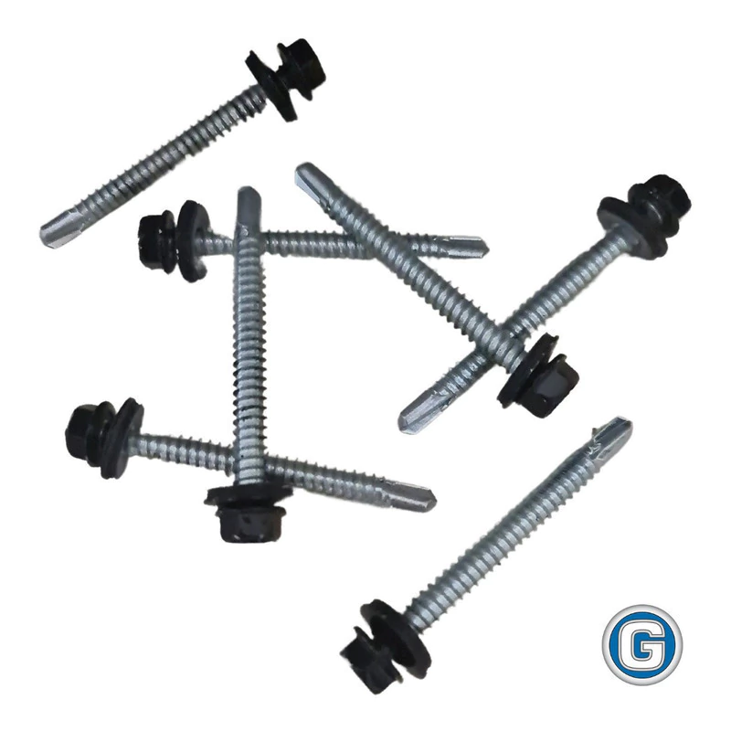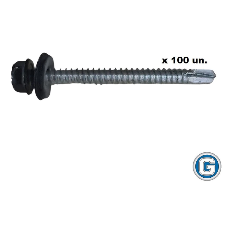 BOLSA DE 100 UNIDADES DE TORNILLOS AUTOPERFORANTES CABEZA HEXAGONAL PUNTA MECHA CON CABEZA Y ARANDELA DE COLOR NEGRO CON ARANDELA DE GOMA VULCANIZADA EN LA ARANDELA.