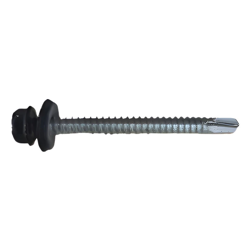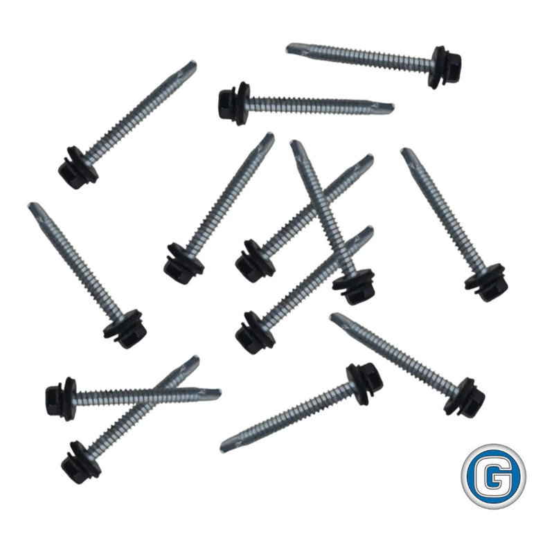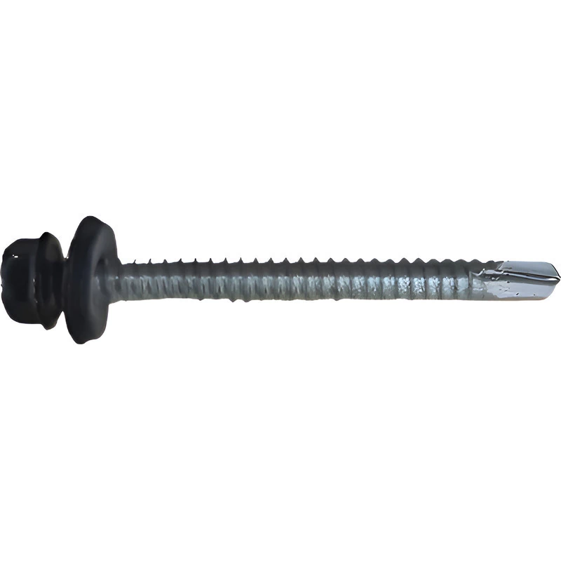 BOLSA DE 100 UNIDADES DE TORNILLOS AUTOPERFORANTES CABEZA HEXAGONAL PUNTA MECHA CON CABEZA Y ARANDELA DE COLOR NEGRO CON ARANDELA DE GOMA VULCANIZADA EN LA ARANDELA.