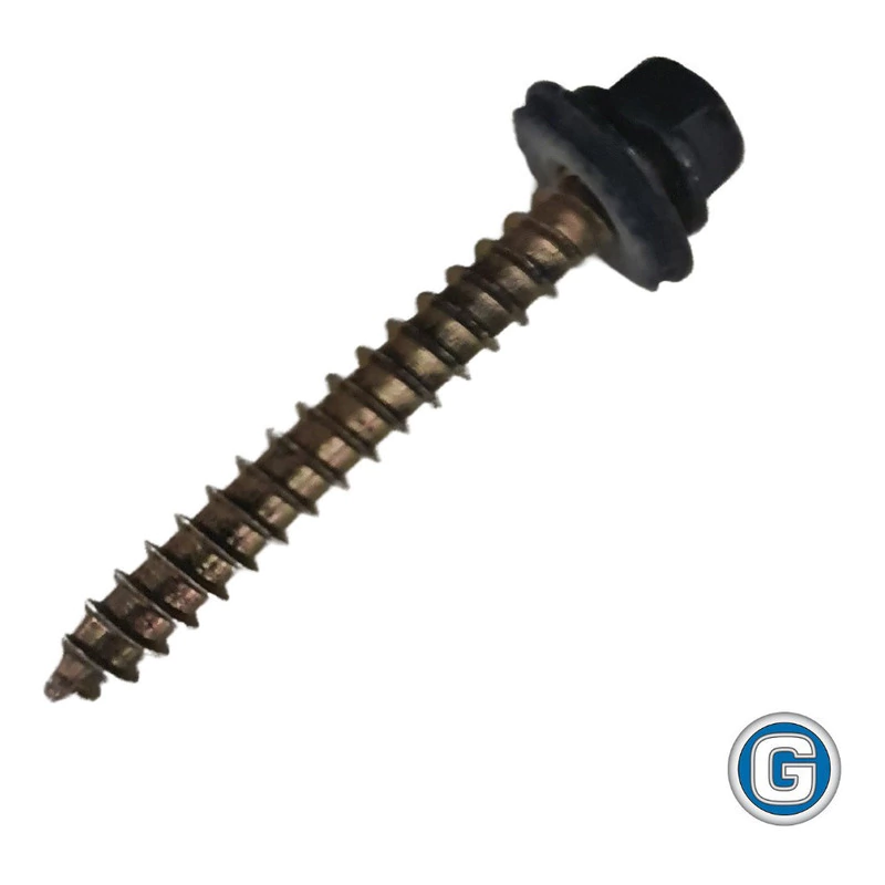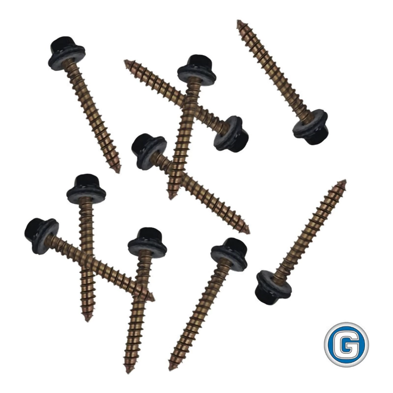 BOLSA DE 100 UNIDADES DE TORNILLOS AUTOPERFORANTES CABEZA HEXAGONAL PUNTA AGUJA (PARA ATORNILLAR EN TIRANTES DE MADERA O ALFAJIAS) CON CABEZA Y ARANDELA PINTADAS DE COLOR NEGRO. LAS ARANDELAS SON DE CHAPA CON GOMA VULCANIZADA.