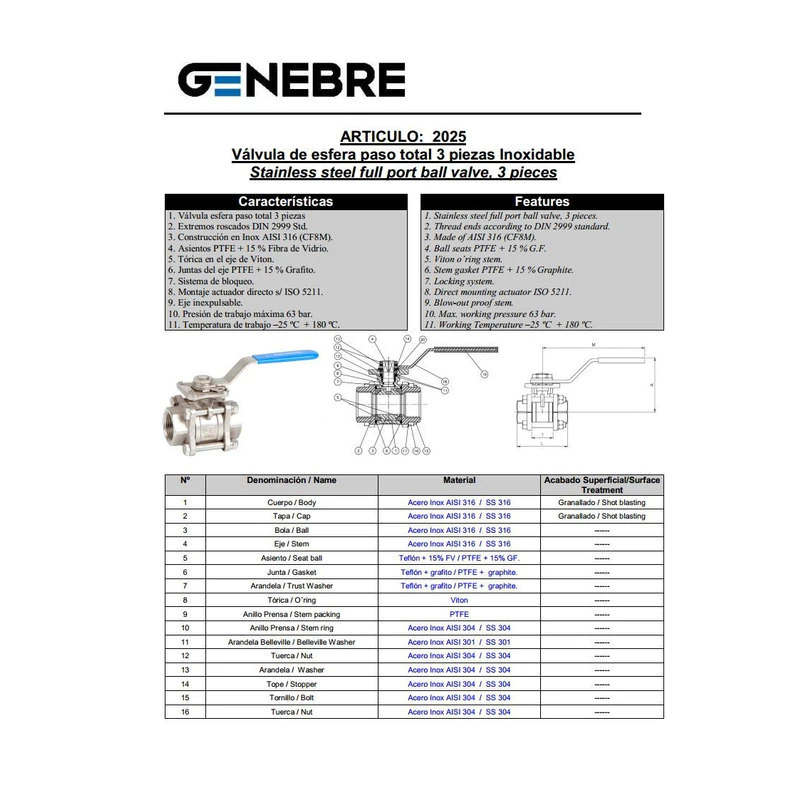 Válvula Esférica GENEBRE De Acero Inoxidable AISI 316 de Tres Cuerpos de Ø 1 1/2" Roscada BSPT